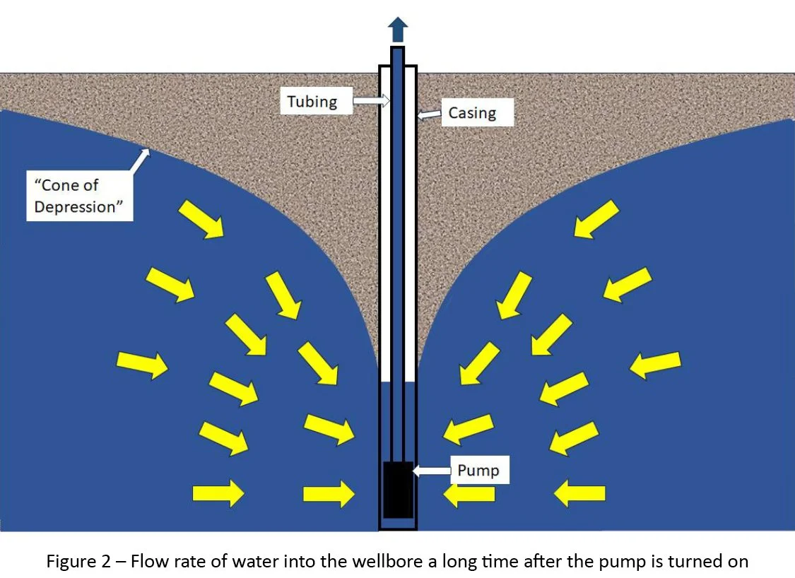 When you first turn the well pump on, water in the aquifer close to the wellbore flows quickly into the wellbore and into the pump. (Figure 1)